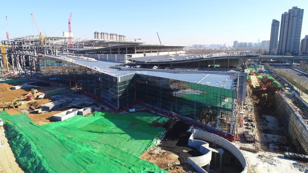 目前,展館區(qū)域已完成5個展館及4、5號館共享大廳、西輔房區(qū)域主體鋼結(jié)構(gòu)與二次結(jié)構(gòu)施工,正在進行裝飾安裝工程。地下車庫已完成除軌道M1線預(yù)埋段區(qū)域主體結(jié)構(gòu)施工,正在進行二次結(jié)構(gòu)、裝飾安裝、室外回填及剩余地下車庫主體結(jié)構(gòu)工程施工。