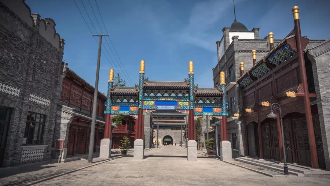 由濟(jì)南城市建設(shè)集團(tuán)、華誼兄弟傳媒股份有限公司、華誼兄弟實景娛樂有限公司合力打造的華誼兄弟電影城(濟(jì)南)老濟(jì)南街占地85畝,是清末民國初期為時代背景的北方街區(qū),中西式建筑風(fēng)格交相輝映,包含城門、商店街、火車站、醫(yī)院、警察廳、城隍廟等,共計72棟單體建筑。