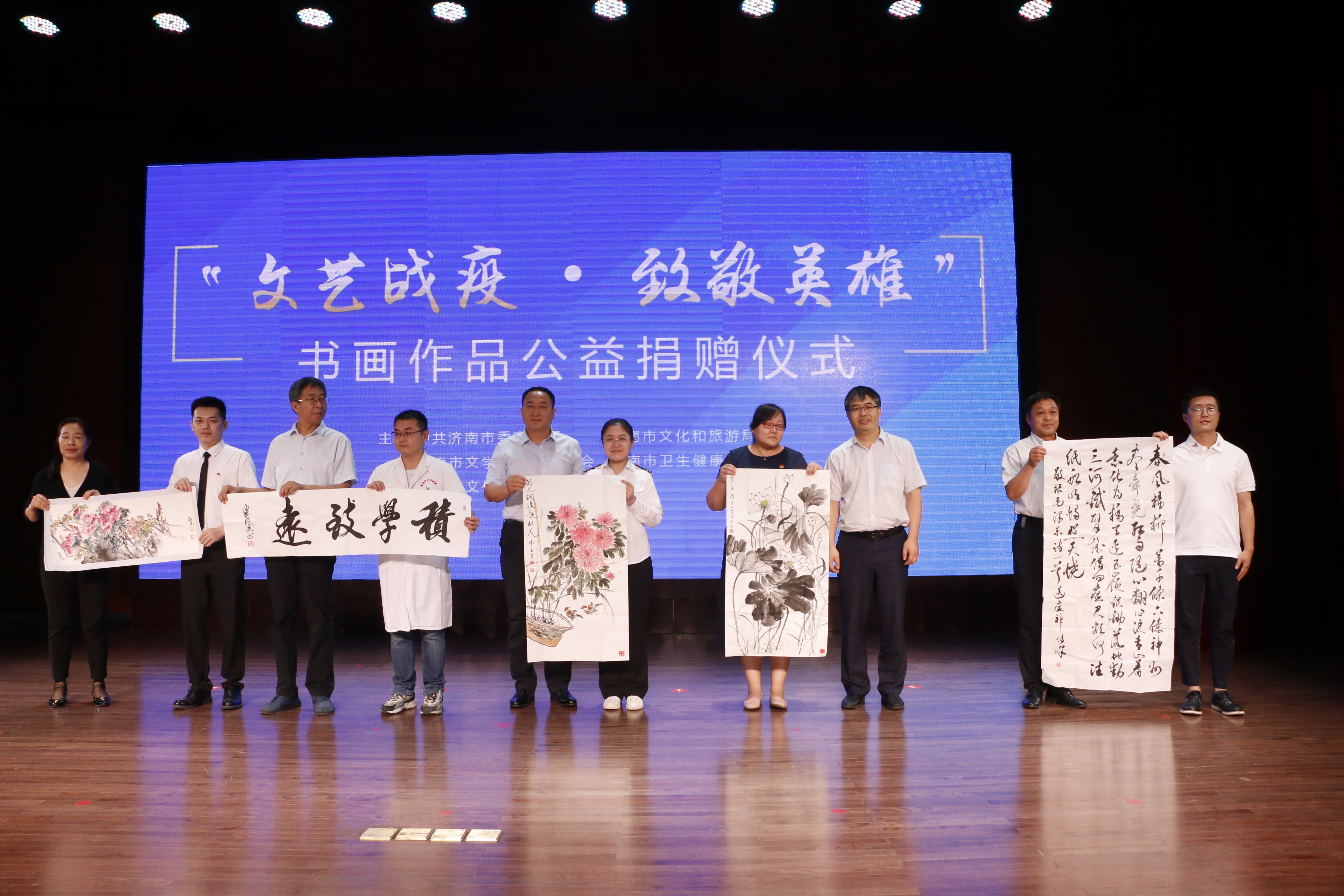 為進一步加強疫情防控宣傳工作,充分發揮濟南市文藝戰線優勢作用,用文藝的形式向抗擊疫情一線英雄致敬,6月9日,由市委宣傳部、市文化和旅游局、市文學藝術界聯合會、市衛生健康委員會主辦,市文化館承辦的“文藝戰疫·致敬英雄”濟南市書畫作品公益捐贈儀式在市文化館多功能廳舉行。市委宣傳部、市文化和旅游局、市文聯、市衛健委等主承辦單位相關負責同志以及書畫作品捐贈藝術家代表、援鄂醫護工作者等抗擊疫情一線的各界代表共計80余人參加活動。
