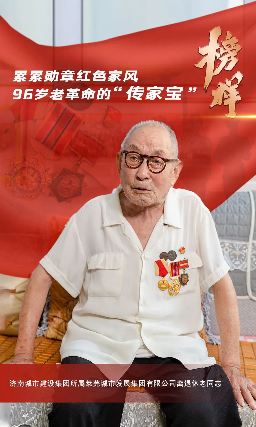 1946年參軍,1948年入黨,參加過濟南戰役、淮海戰役、渡江戰役、上海戰役、抗美援朝,并多次榮立戰功……在濟南城市建設集團所屬萊蕪城市發展集團有限公司的離退休老同志中,有這樣一位勛章累累的96歲老革命——戴風樓。他謙虛勤懇、艱苦樸素,幾十年革命及工作生涯堅定感黨恩、跟黨走;他以身作則、家風清正,紅色基因在家庭中、在工作崗位上代代傳承。