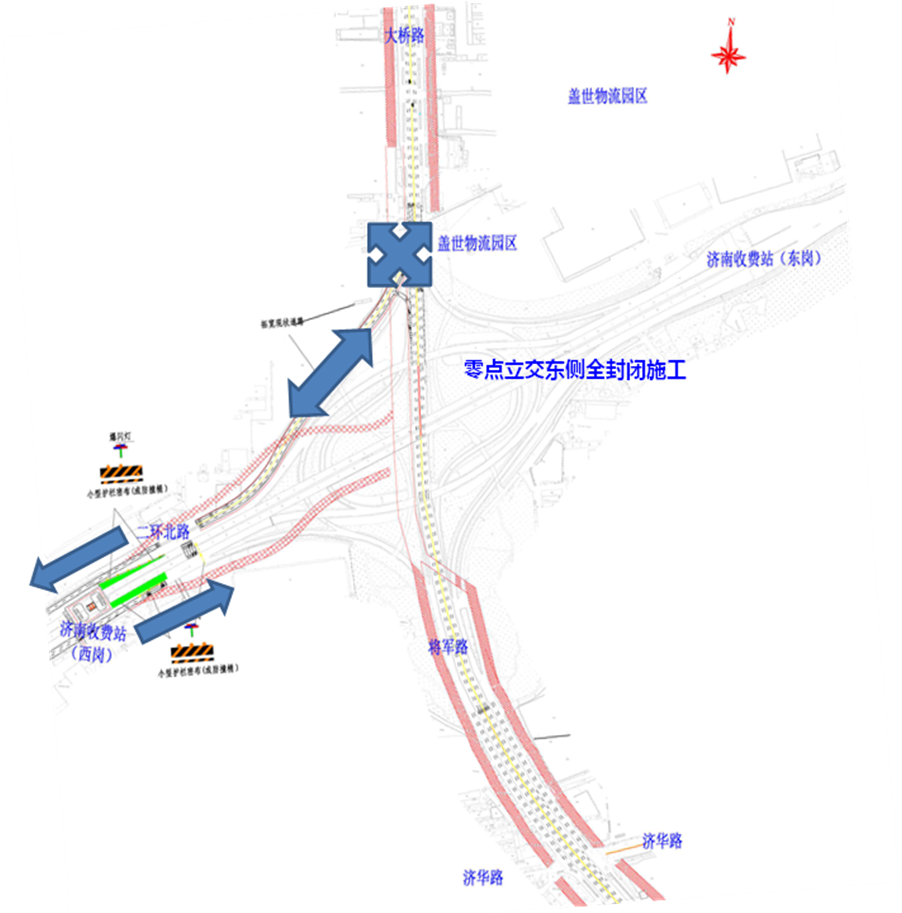 在此期間,零點立交橋下的大橋路南北向及G35濟(jì)廣高速主線東西向車輛正常通行。二環(huán)北路由西向東前往零點立交以北的左轉(zhuǎn)車輛,需通過零點立交橋西北象限擴建現(xiàn)狀道路與大橋路交叉口(現(xiàn)狀燈控口)進(jìn)行交通轉(zhuǎn)換。其它車輛均需通過外圍相關(guān)道路繞行。
