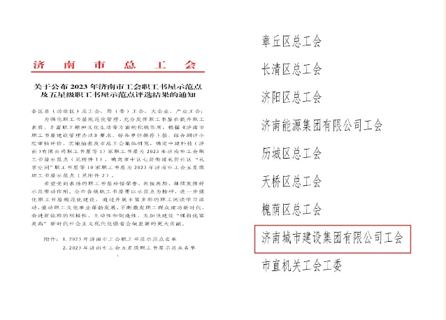 12月18日,濟南市總工會發布《關于公布2023年濟南市工會職工書屋示范點及五星級職工書屋示范點評選結果的通知》,濟南城市建設集團有限公司職工書屋獲評2023年濟南市工會職工書屋示范點。