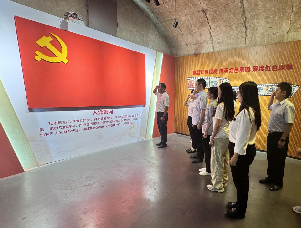 在紅色文化教育和國防知識普及長廊,大家學習了黨的一大到二十大的百年奮斗歷程,了解了泉城人民防空建設歷史。隨后,大家莊嚴宣誓,重溫入黨誓詞。